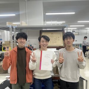 写真左より、松尾蒼平(博士前期課程2年)、藤井理央(同)、中江勇貴(同)
