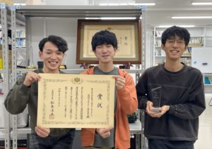 授賞式は2025年11月20日(木)、千葉県の幕張メッセで行われ、学生チームの代表として、中江勇貴(博士前期課程2年)、藤井理央(同)、松尾蒼平(同)が授賞式に出席しました。